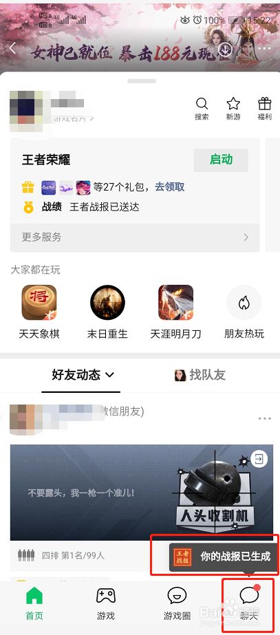 若是是周一刚好有推送的话可以看到在右下角的“聊天”菜单上面就是“王者战报”;