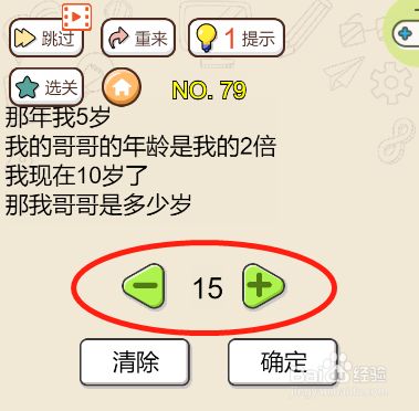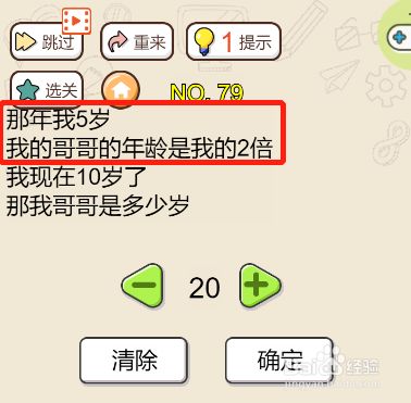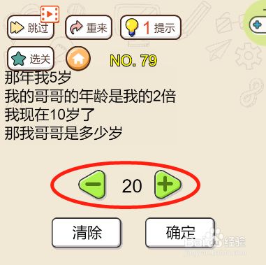 工具/原料联想小新13window10方式/步骤1这一关的标题问题看上去像是一道数学题2粗略看问标题问题的时辰可能有人会觉得谜底是203可是选定20作为谜底之后会提醒谜底错误4细心看标题问题会发现我5岁的时辰,哥哥春秋是我的两倍也就是10岁。5那么我10岁的时辰,哥哥的春秋应该是10+(10-5)=15岁而不是10*2=20岁6设置15作为我们的谜底而且点击确定就可以顺遂过关了END