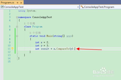 插入语句:“int result = x.CompareTo(y);”,利用整型的CompareTo()方式比力变量 x 和 y。