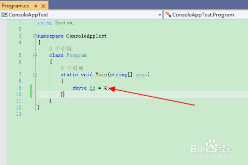在 Main() 本家儿函数中,插入语句:“sbyte bA = 4;”,界说一个sbyte对象。