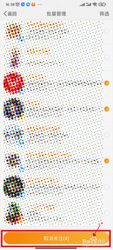 将页面切换到批量办理模式,点击勾选需要删除的人后的圆圈,然后点击页面底部的【打消存眷】。