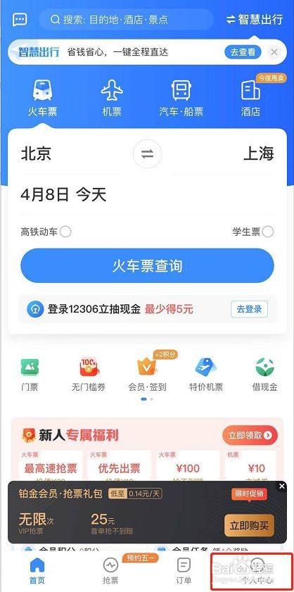 首先打开智行火车票软件,点击下方的【小我中间】。