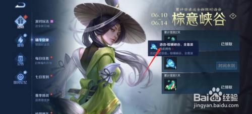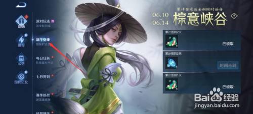 工具/原料华为mate40EMUI11.1.0王者荣耀3.1.15方式/步骤1选择点击起头游戏进入到游戏中。2选择点击右侧的活动选项。23选择点击左侧的端午安康选项。4在游戏中完当作登录签到使命。5累计签到3天即可获得粽横峡谷,端赖浪语音。END注重事项累计签到3天即可获得粽横峡谷,端赖浪语音。