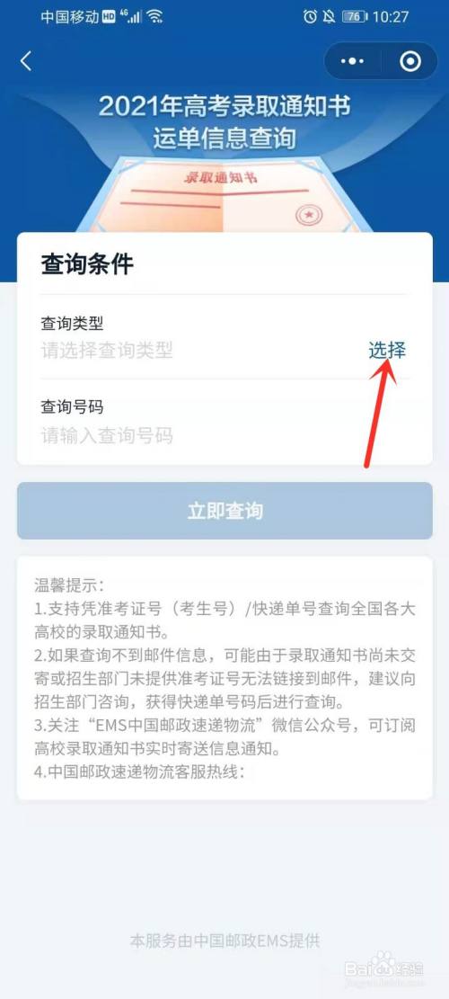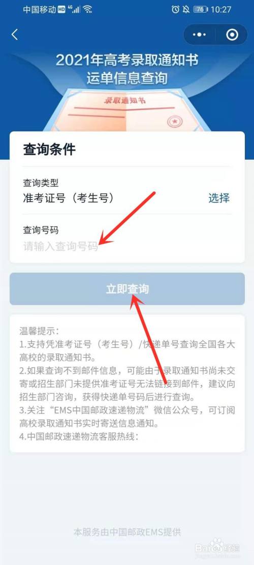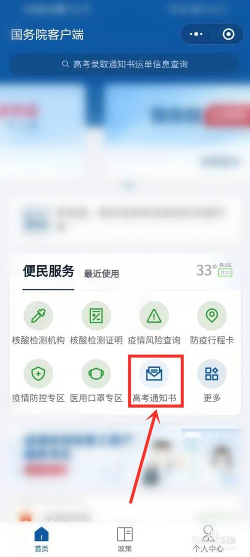点击“便民办事”下面的“高考通知书“,进入高考登科通知书物流信息查询界面。