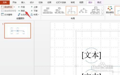 选择“降级”按钮,被选择的图形将会下降一级,例如选择需要更改布局的图形,在“设计”选项卡的“建立图形”组中单击“降级”按钮,