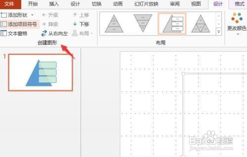 打开已建立SmartArt图形的文件,选择需要更改布局的图形,在“设计”选项卡的“建立图形”组中单击“进级”按钮
