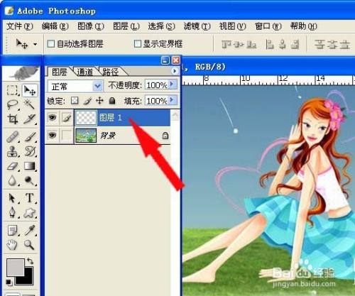 3、在图层面板上,新建一个图层,名称主动取名为图层1,它在布景层上面,而且是透明图层。