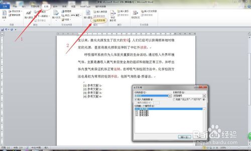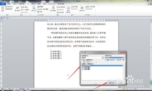 下面起头插入引用。依次点击:引用——交叉引用,会主动弹出对话框;将光标放置在“转变”后面,点击对话框中的“[1] 参考文献1”,点击插入,按此方式依次将所有的参考文献插入对应的位置。这样参考文献就引用好了。