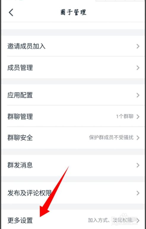 第五步,打开圈子办理界面,滑动屏幕到底部,点击更多设置。如图所示