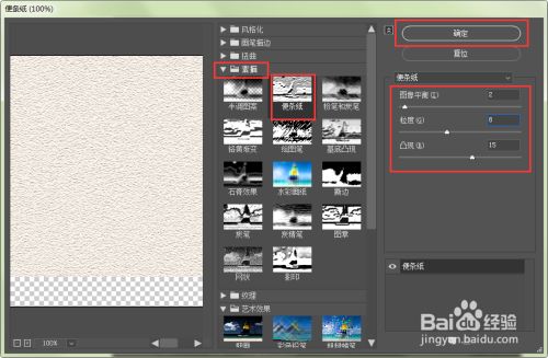 我们在素描中选择【条子纸】,然后在右边把图像均衡调整为2,粒度为8,凸现为15,点击【确定】,如图所示。