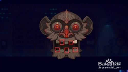 然后交互左边墙上的山公面具,呈现小游戏。这个游戏需要我们把山公的牙齿按下,参照适才看到的十字绣,把带叉的对应的牙齿按下去即可。