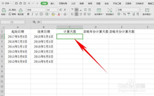 在单位格傍边输入公式=DATEDIF(A2,B2,”d”),单击回车。