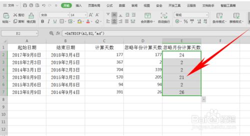 回车后,两个日期之间忽略月份的天数就已经当作功计较出来了,单击下拉填充框,完美整个表格。