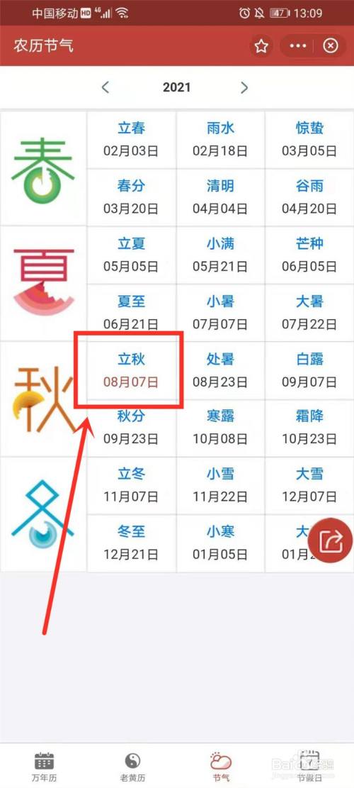 进入骨气界面,即可查看2021年立秋的具体日期。