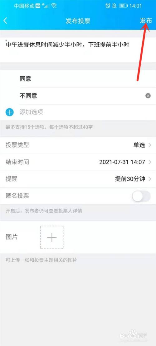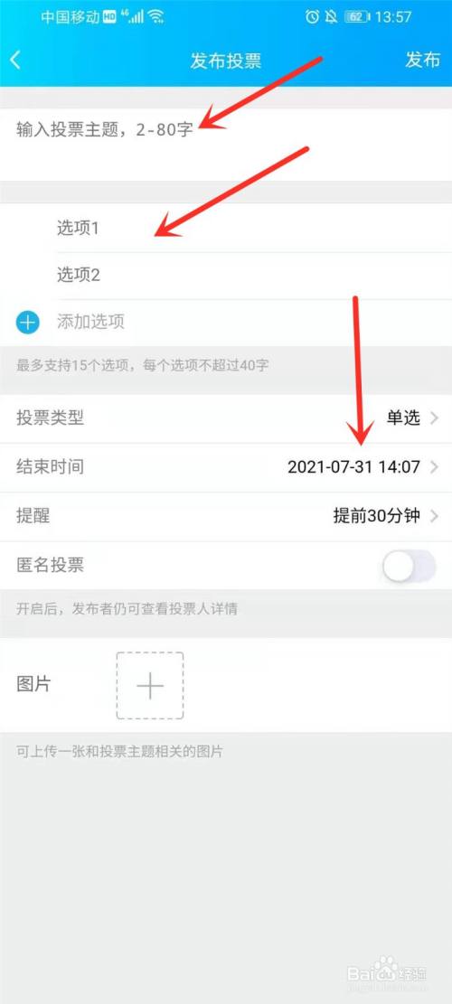 进入发布投票界面,设置投票本家儿题、投票选项以及投票竣事时候。