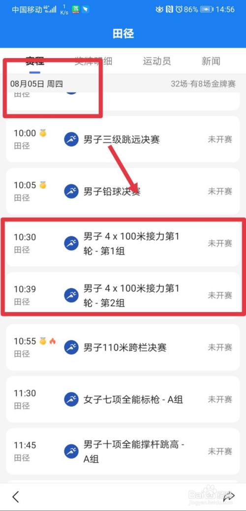 在田径项目详情页面,标的目的下拉动页面,在8月5日10:30分,可以看到男人4*100米接力赛将开启第一轮角逐。