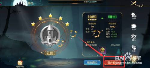 工具/原料小米10sMIUI12.5有杀气童话21.2.1方式/步骤1进入有杀气童话2游戏,点击【头像】,点击【爵位】,点击【晋升爵位】。2点击【晋升爵位】。3与国王对话。4期待过场动画完当作。5即可晋升爵位为骑士。END总结:11、进入有杀气童话2游戏,点击【头像】,点击【爵位】,点击【晋升爵位】。2、点击【晋升爵位】。3、与国王对话。4、期待过场动画完当作。5、即可晋升爵位为骑士。END