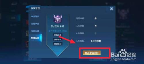 进入【战队办理】后,选择【根本设置】后选择点击【点窜申请前提】。如图: