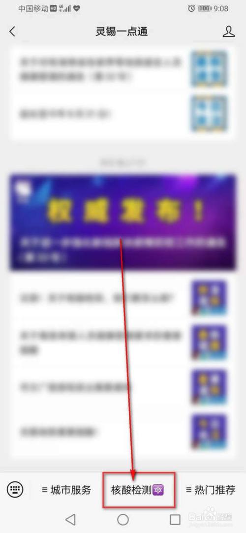 打开“灵锡一点通”微信公家号,点击“核酸检测”。