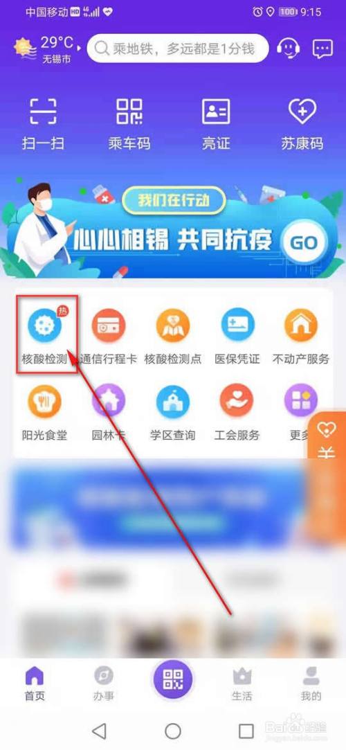 打开灵锡App首页,点击“核酸检测”。