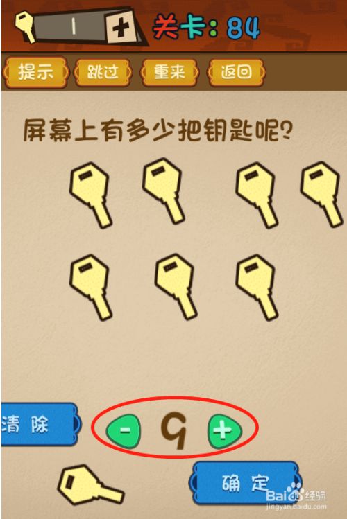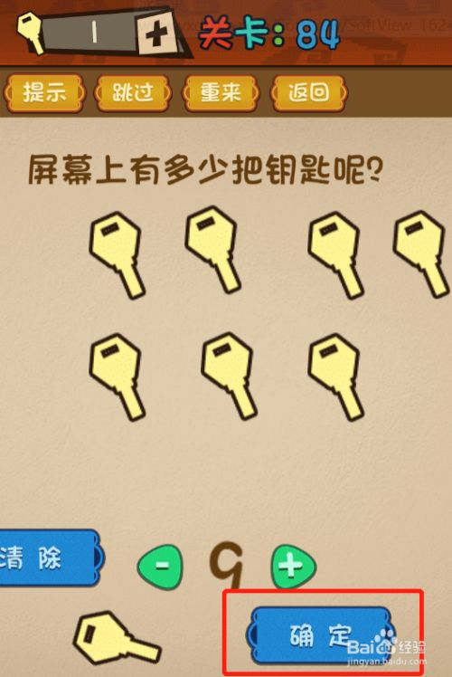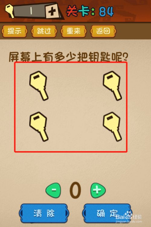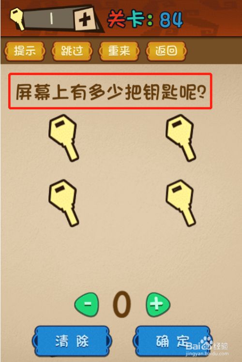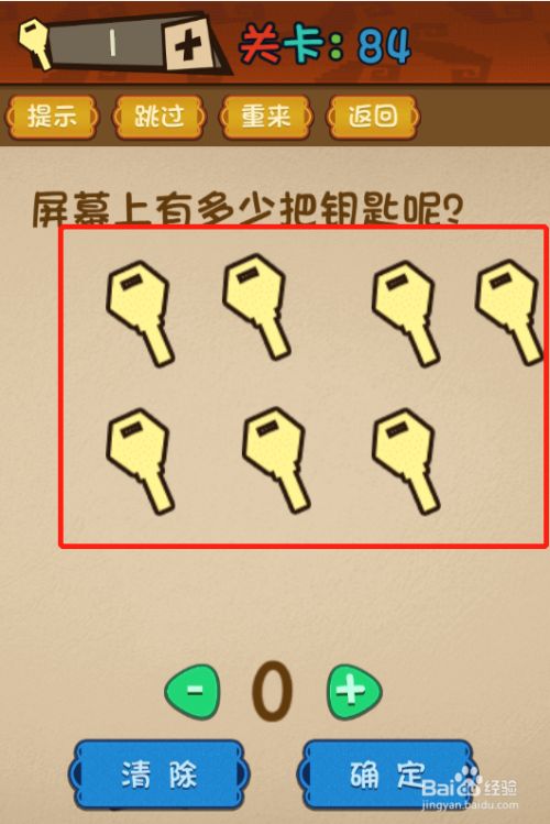 工具/原料联想小新13window10方式/步骤1首先看一下这一关的要求是什么2可以看到正面给出的钥匙已经有四把了3然后移动这些钥匙看一下有没有重叠的钥匙4不要忘了过关提醒处的那一把钥匙5然后看一下按钮后面有没有藏着钥匙6找到所有埋没的钥匙之后设置谜底为97接着点击右下角的【确定】按钮8这样子就顺遂过关了END