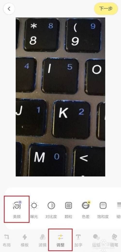 点击【调整】,点击【美颜】。