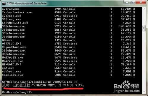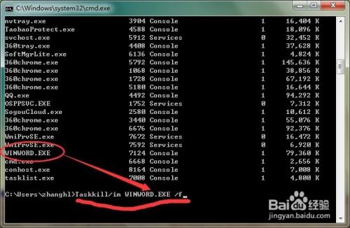 这样就会看到所有的应用程序都被列出来了,我们要找到Word应用程序,然后将其封闭,就是“WINWORD.EXE”,然后输入“Taskkill/im WINWORD.EXE /f”,注重:“WINWORD.EXE ”的前后需要空一个字符,然后按下回车键。