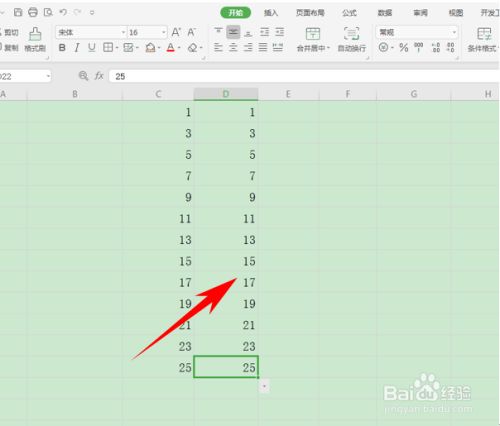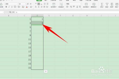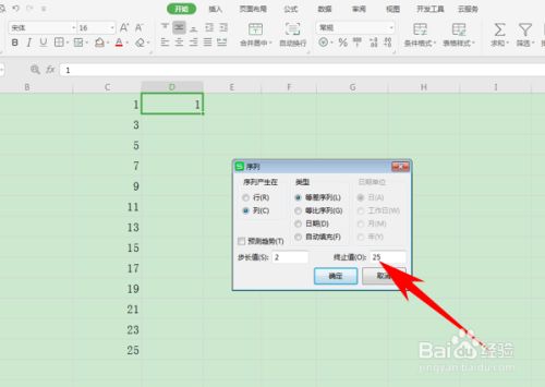弹出序列的对话框,选择序列发生在列,类型选择等差序列,然后将步长值设置为2,终止值设置为25,单击确定。
