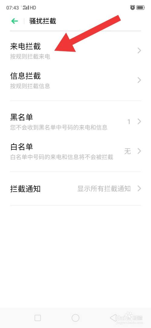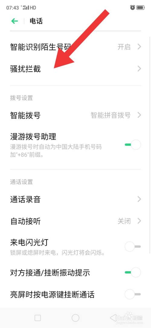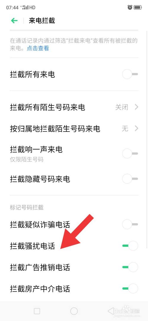 点击打开“阻挡骚扰德律风”右边的按钮即可。