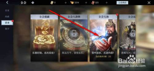 工具/原料荣耀9xEMUI10.1.0.133真三国无双霸1.3.0方式/步骤1进入真三国无双霸手游,点击右下角的弹出菜单图标。2点击“公会”。3点击“活动”。4点击“公会合作”。5点击“捐助”。6捐助当作功获得20进献币,点击屏幕空白处封闭即可。END注重事项每日仅可捐助2次。