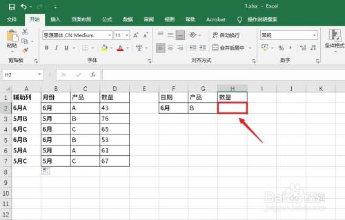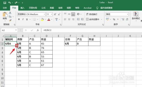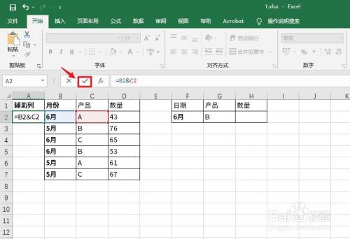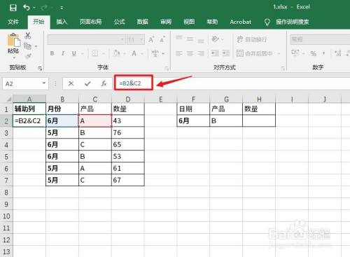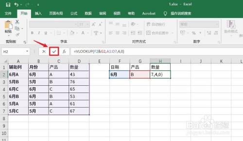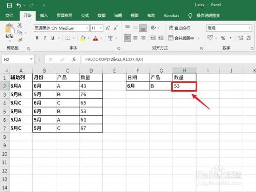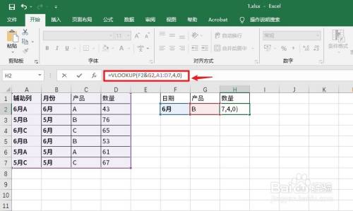 输入匹配函数:=VLOOKUP(F2&G2,A1:D7,4,0)。