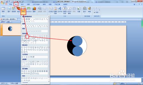 插入——外形——椭圆——按shift键画圆形,在大圆内画两个垂直相切的小圆。