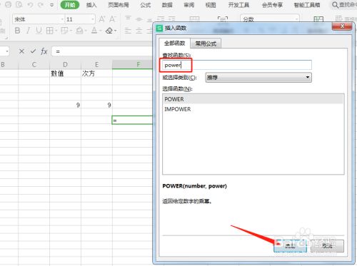 在插入函数对话框中输入【power】后点击【确定】。