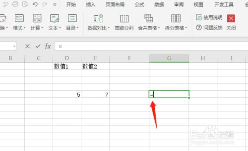 打开电脑中的【EXCEL】软件,在肆意两个空白单位格中输入数值【5】和【7】。