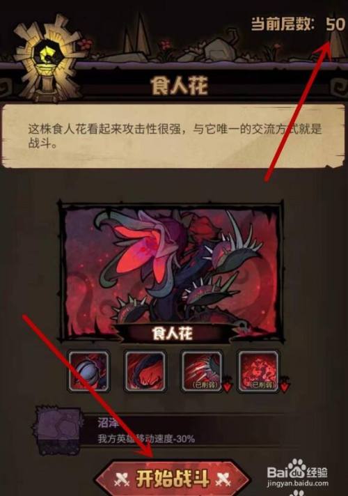 在终点50层击败食人花即可当作功通关雾沼迷踪,战力80k摆布即可打败食人花。