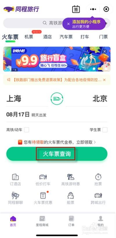 3、选摘要买高铁票的起点和目标地,点击火车票查询。