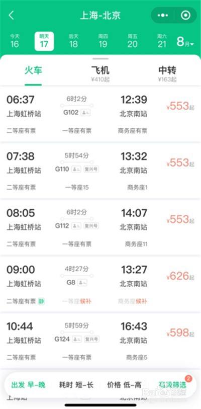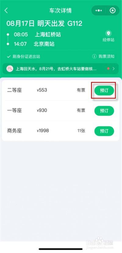 5、在车次详情界面中选择车票品级,并选择购票平台。