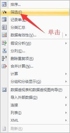 在数据下拉菜单中单击【筛选】,此时您就会发现您整张表的每一列的表头的下方城市呈现一个倒三角的下拉标记;