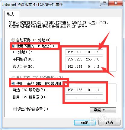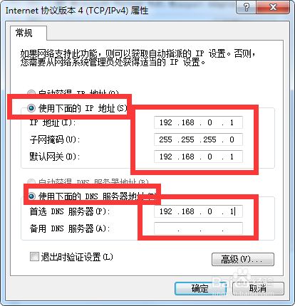 在进入TCP/IPV4属性界面后,别离点击利用下面的ip地址和dns办事器地址,并在ip地址栏输入ip:192.168.0.1子网掩码:255.255.255.0默认网关:192.168.0.1,在dns地址栏输入192.168.0.1,备用不填并点击确定