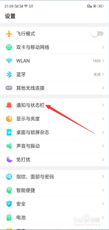 在手机设置本家儿界面,往下拉,找到通知宇状况栏,如下图,并将其打开,进入通知宇状况栏界面,如下图
