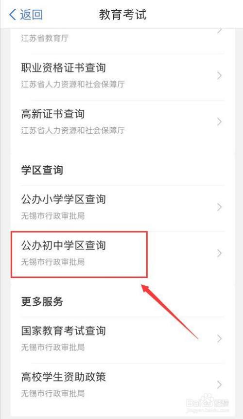 在教育测验界面,点击【公办初中学区查询】。