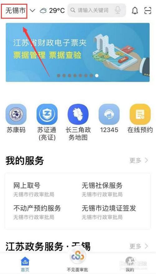 在江苏政务办事首页,定位到无锡市。