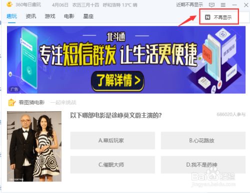 当“360每日趣玩”弹出时,附带的告白让人很是懊恼,也许有小伙伴说,点击右上角处“不再显示”就行了,可是事实上,多一段时候仍是会弹出来。