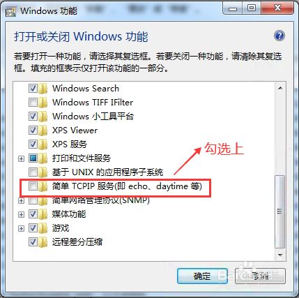下拉找到“简单TCPIP办事(即echo、daytime等)“并将其勾选上,然后点击”确认“,如下图所示: