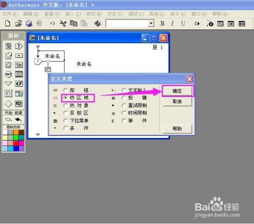 拉一个群组图标到交互图标的右侧,在呈现的交互类型对话框中选择热区域;