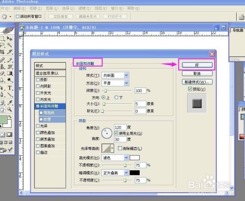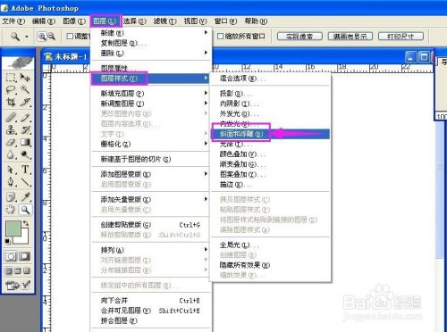 选择图层,在图层样式里选择斜面和浮雕;