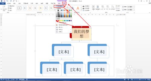 选择题目框后面的矩形,格局——外形填充选择深红——前面的矩形选择浅金色——输入题目文字:我们的胡想。