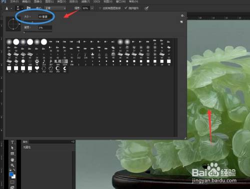 点击属性栏的笔刷,选择一个圆头笔刷,调节硬度为0,调节大小。