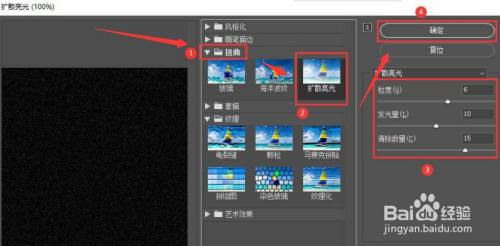 4.打开新窗口中的扭曲栏目,找到扩散亮光选项,如下图所示调整参数后,点击确定保留