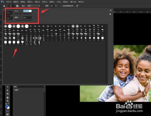 点击属性栏的笔刷,选择一个圆头笔刷,调节硬度为0,调节大小。